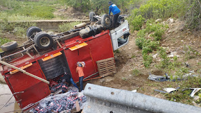 O veículo pertencente a Empresa CB, transportava uma carga de refrigerantes vinda de Iguatu com destino a Tauá, e capotou ficando com os pneus para o alto.